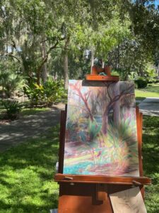 Most of my life, I’ve painted from photos or still lifes. Painting outdoors comes with many challenges (the light changes about every 8 minutes, there can be bad weather, etc.) But it also has some huge advantages: You get to practice composition, you get better at observation, and you also figure out how to paint faster. Your paintings tend to be looser as a result. The colors outdoors are more vibrant, though I have a bit more trouble matching them in the sunlight. You learn to paint in the shade and to bring bug spray and suntan lotion. Some artists just do studies outdoors, then finish up paintings or use the studies to do larger paintings in the studio. Plein air painting is a bit harder because of the logistics, travel, and weather. But I love being outdoors. I have a ton of respect for the painters who do mostly plein air works and turn out amazing pieces. Kathleen Hudson, Tim Beall, Matt Smith come to mind. In Florida, you have to stay alert for alligators, too. You learn not to paint too close to a lake shore.